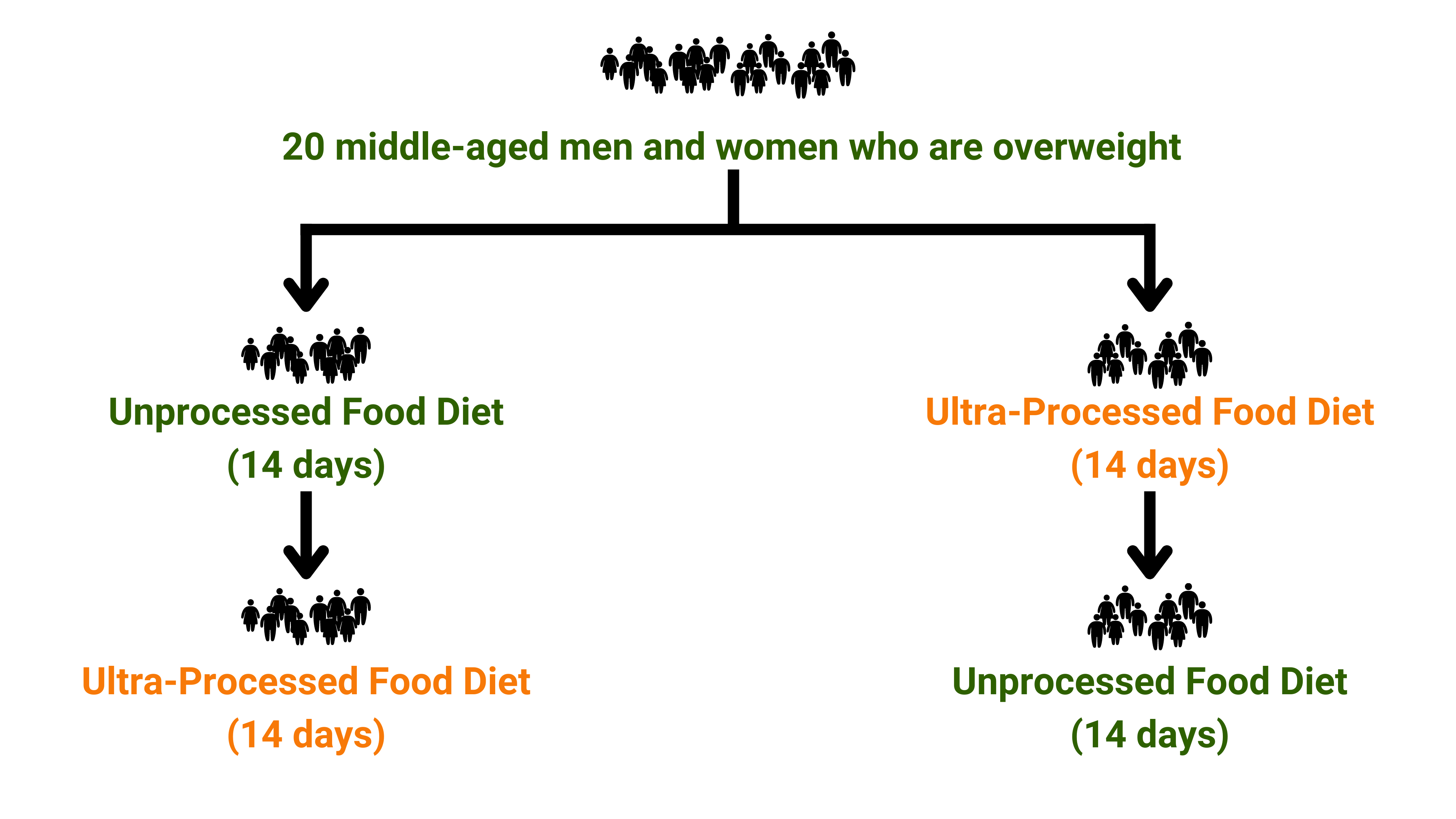 Researchers randomized participants into one of two groups. Group one first ate a diet of mostly unprocessed foods for two weeks, and then they switched to a diet of mostly ultra-processed foods. The second group received these same diets, but in reverse order.