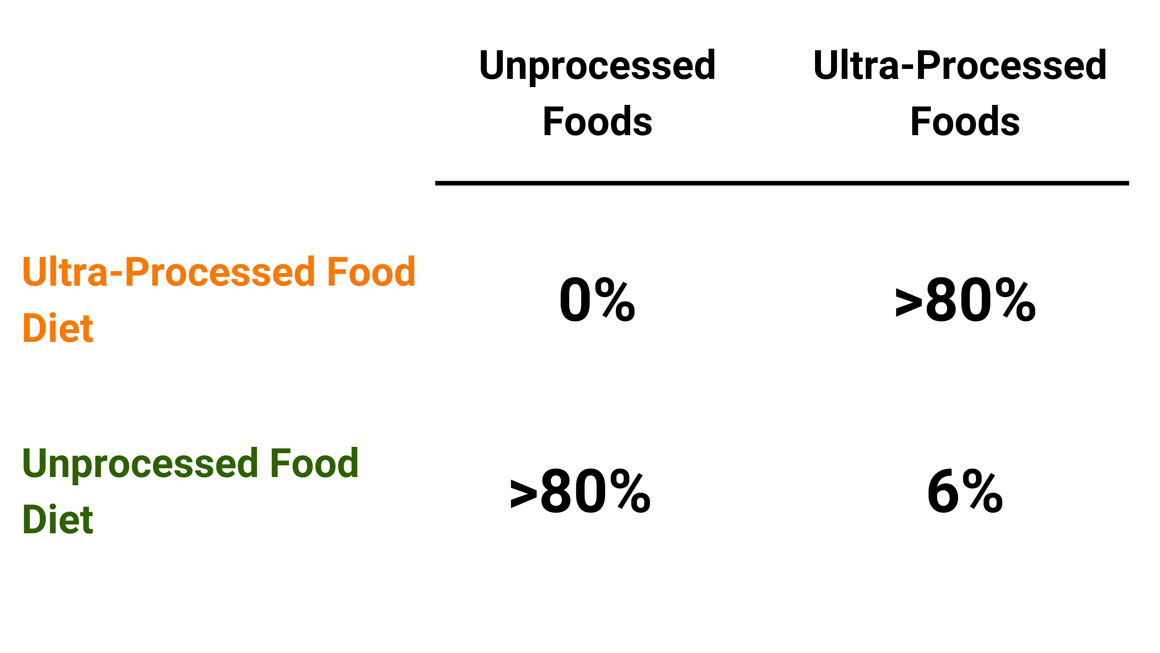On the ultra-processed food diet, ultra-processed food made up more than 80% of all calories served, and unprocessed foods made up 0%.